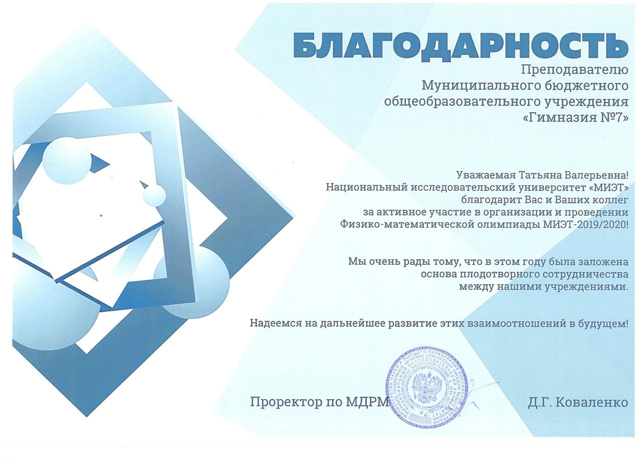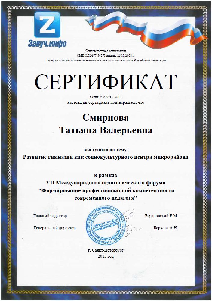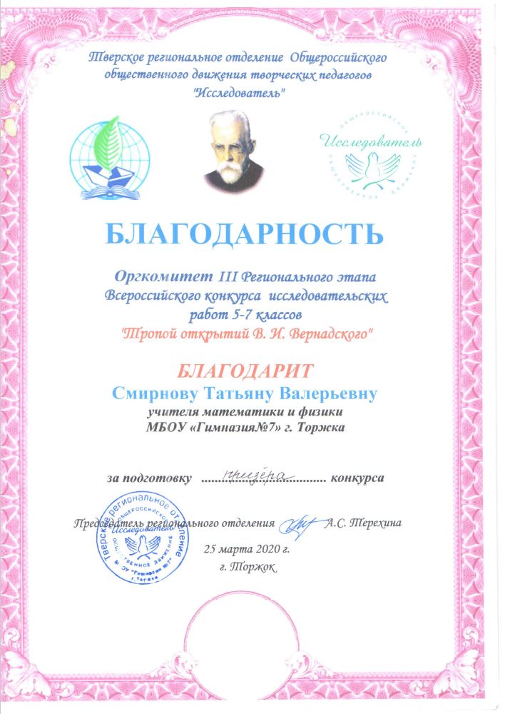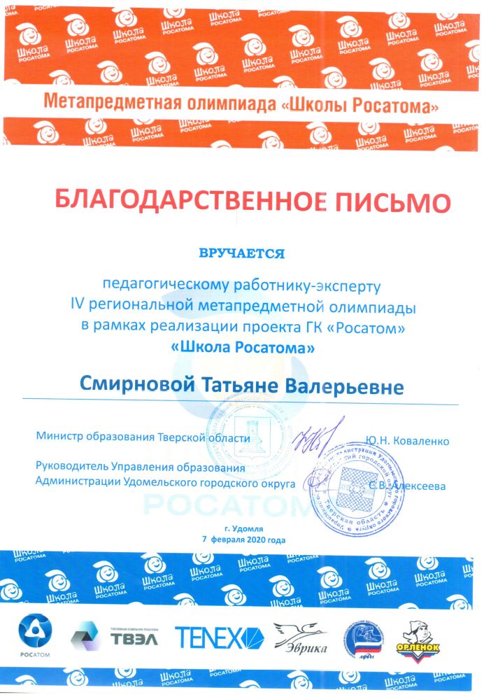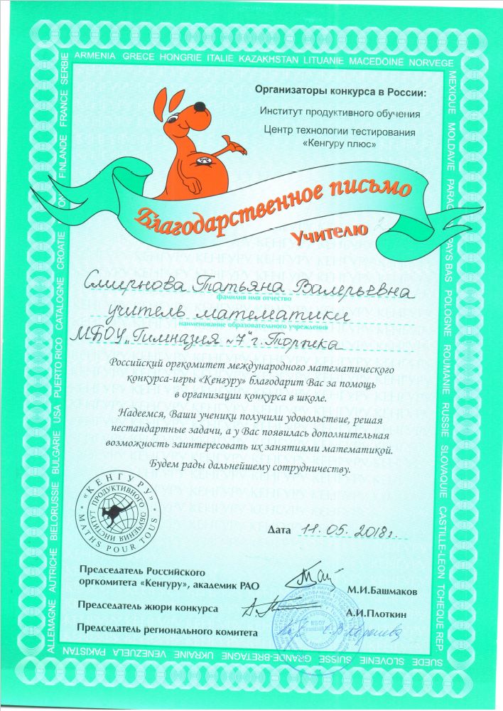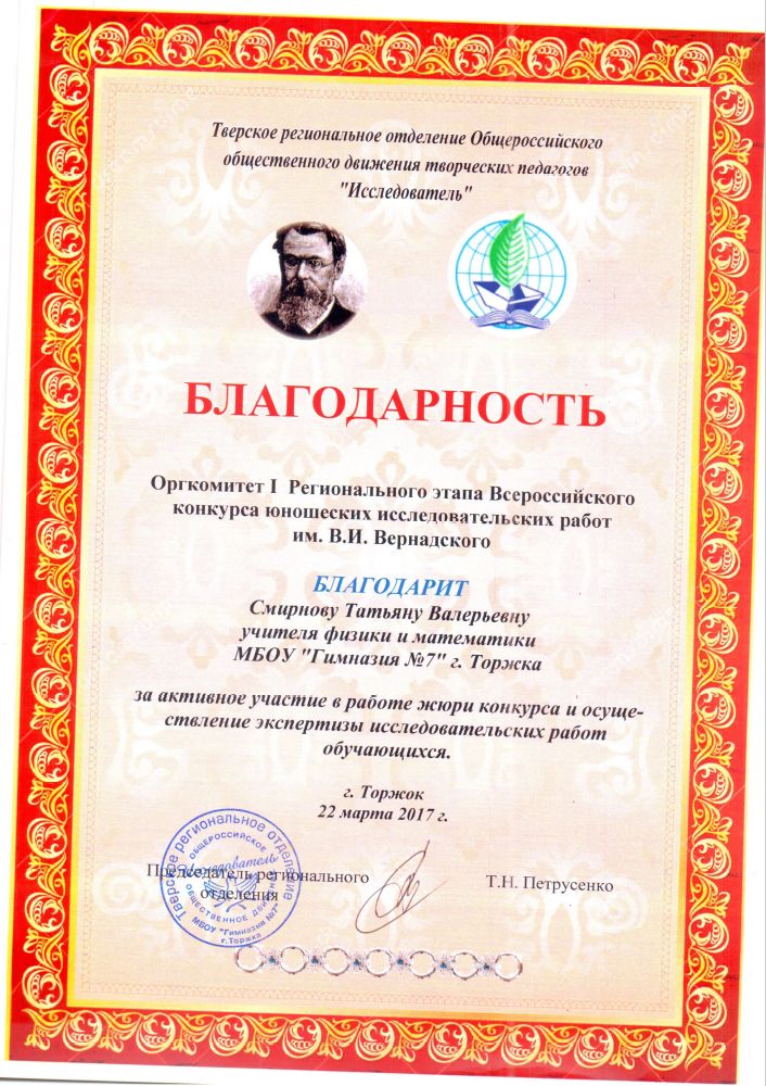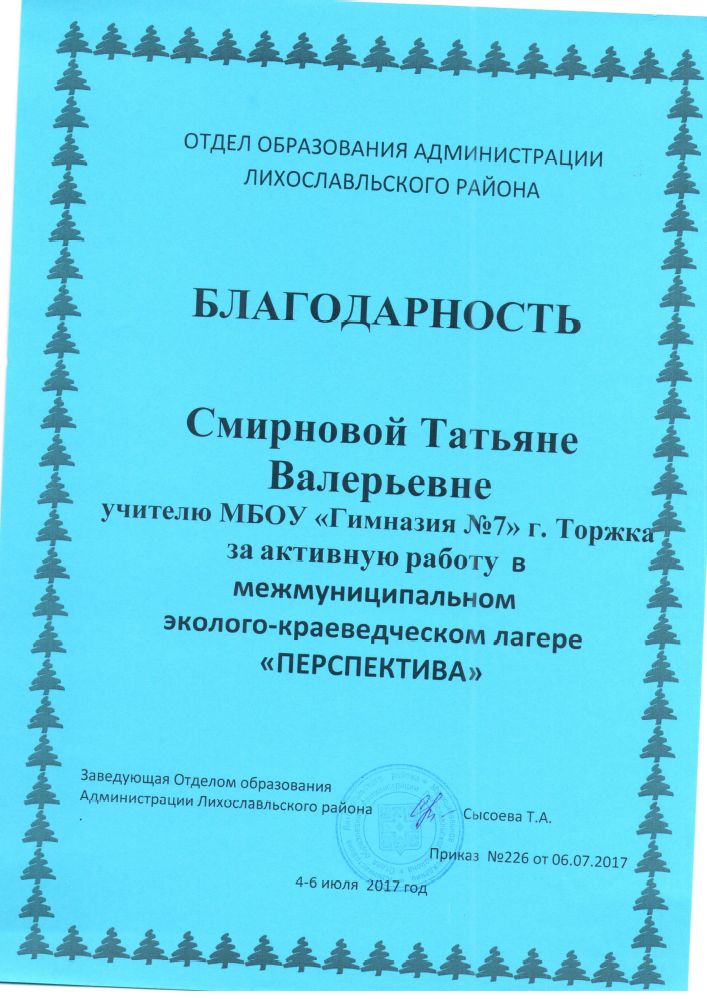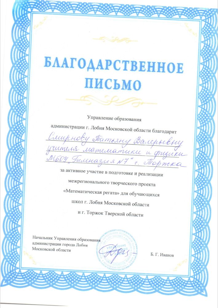- Благодарственное письмо Управления образования администрации г. Торжка. Приказ №280 от 09.12.2015 года