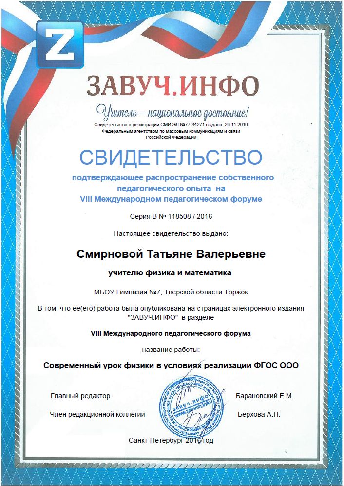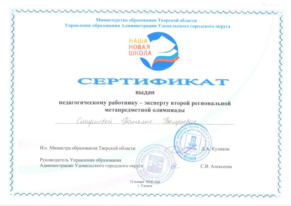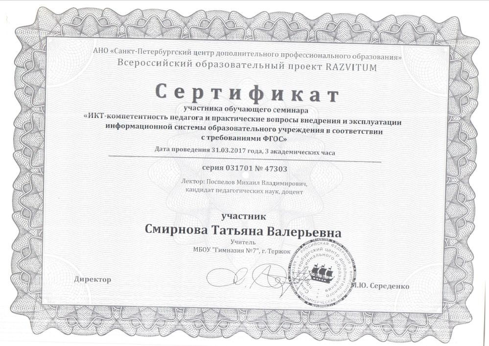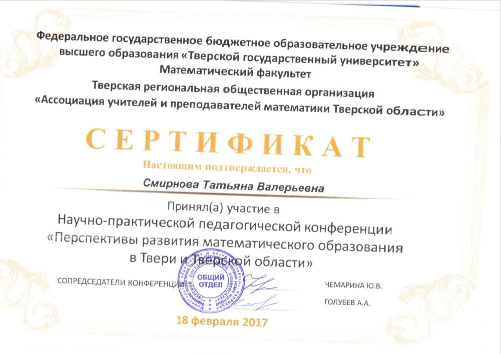 | 2017 | Государственное бюджетное образовательное учреждение дополнительного образования «Тверской областной институт усовершенствования учителей» | Подготовка экспертов для работы в региональных комиссиях при проведении ГИА по общеобразовательной программе основного общего образования. Физика | 18 |