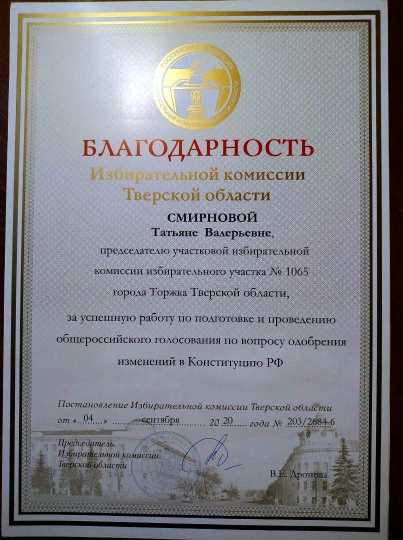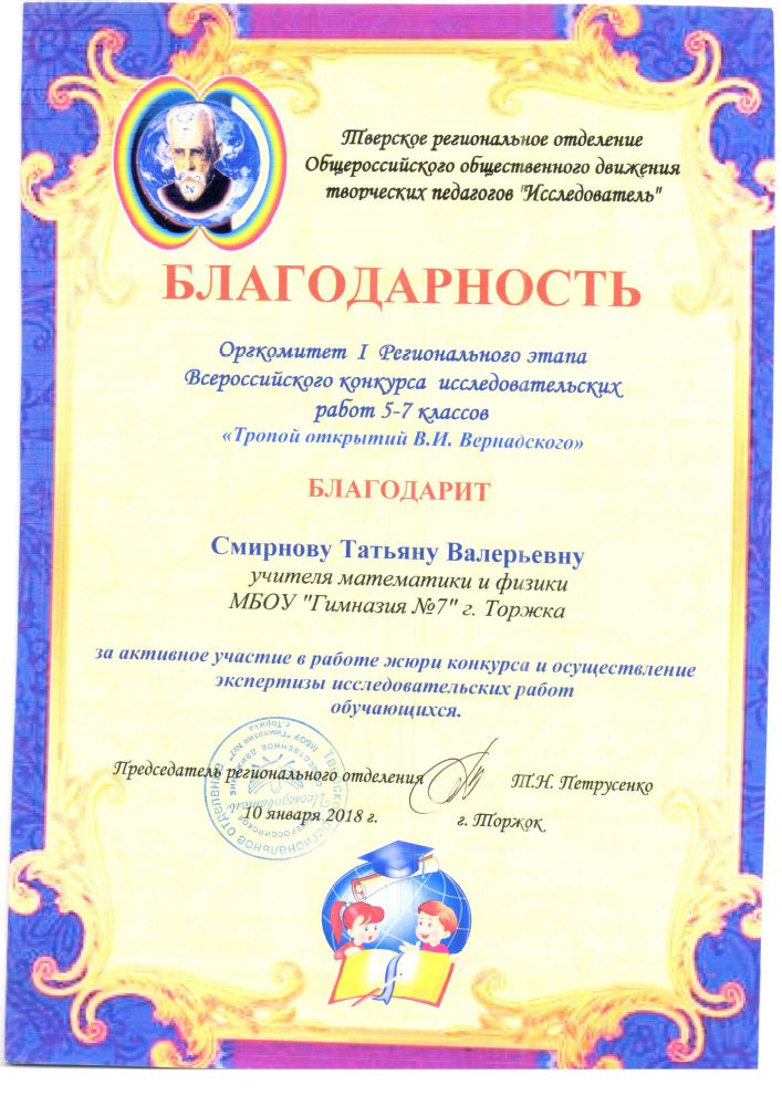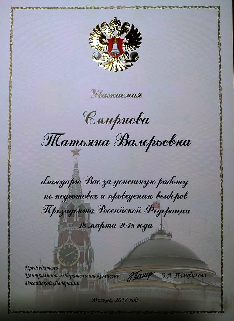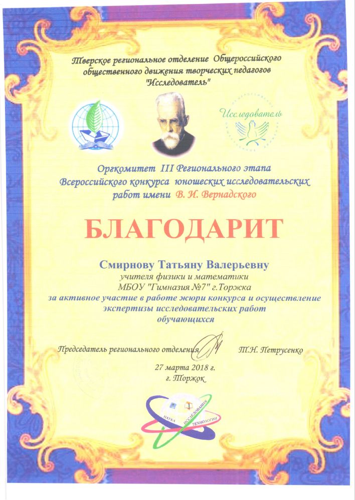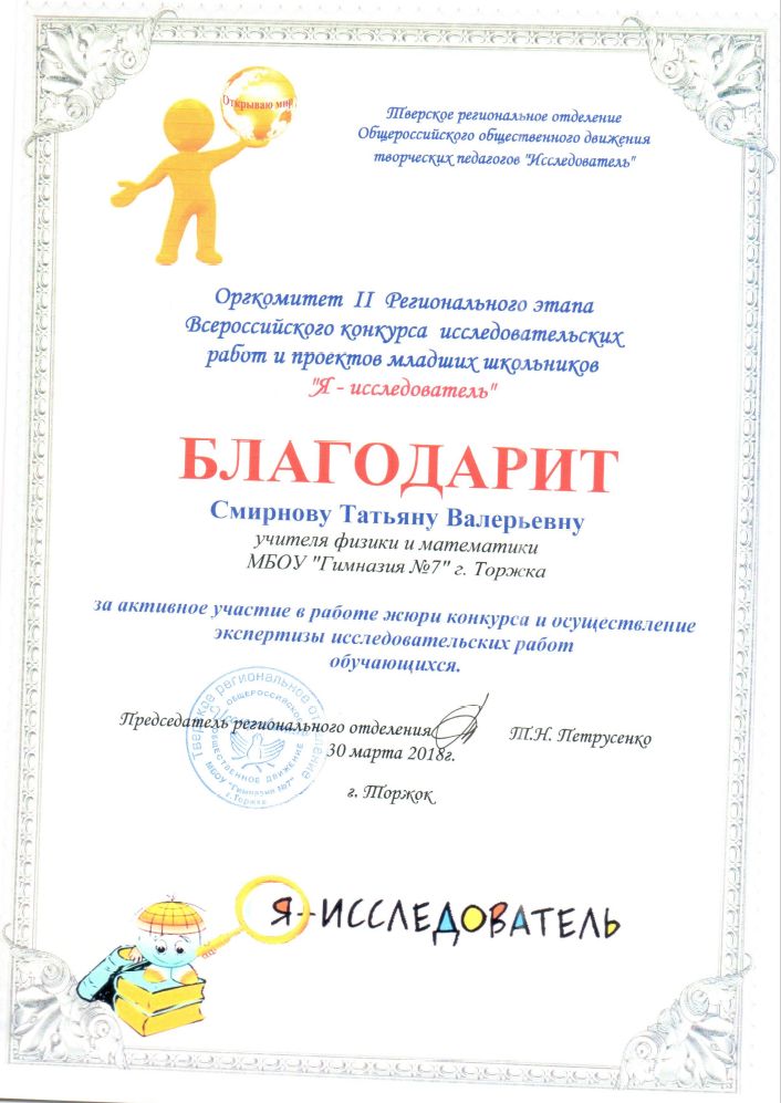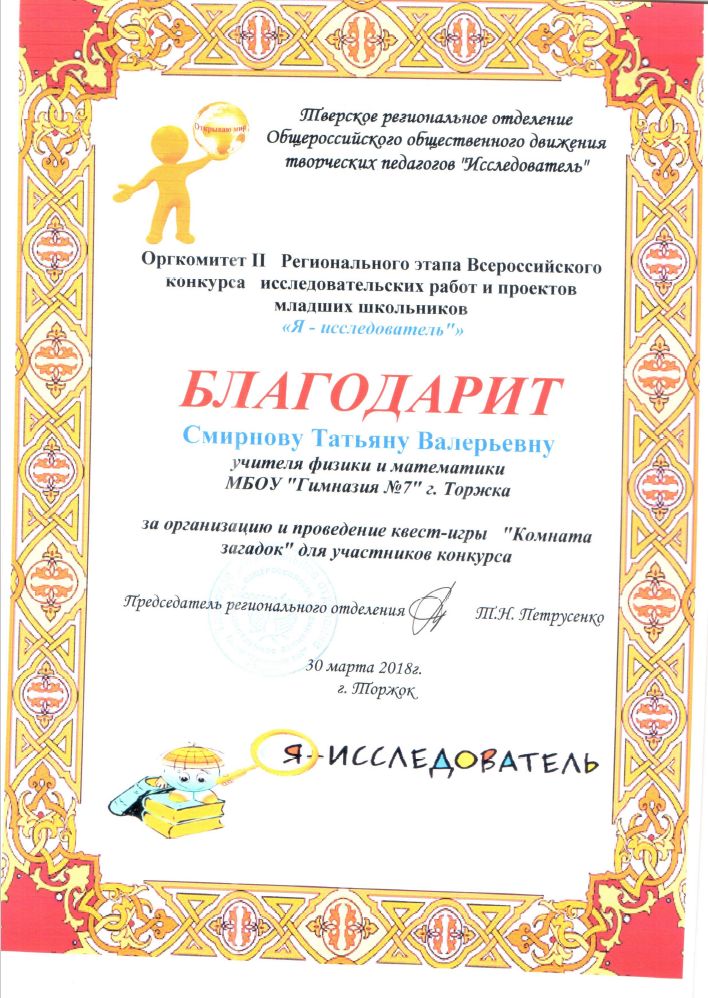 - Благодарственное письмо главы города Торжка. Распоряжение №118-р от 23.03.2018 года