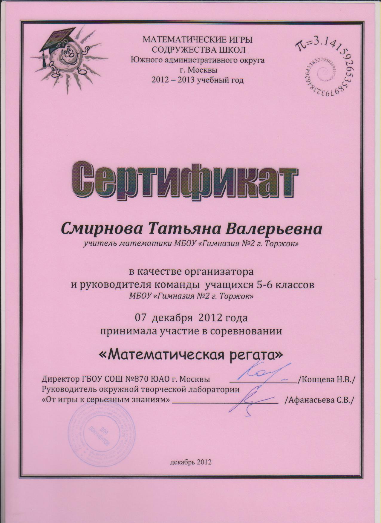 - Благодарственное письмо Управления образования администрации г. Торжка. Приказ №609 от 15.12.2011 года