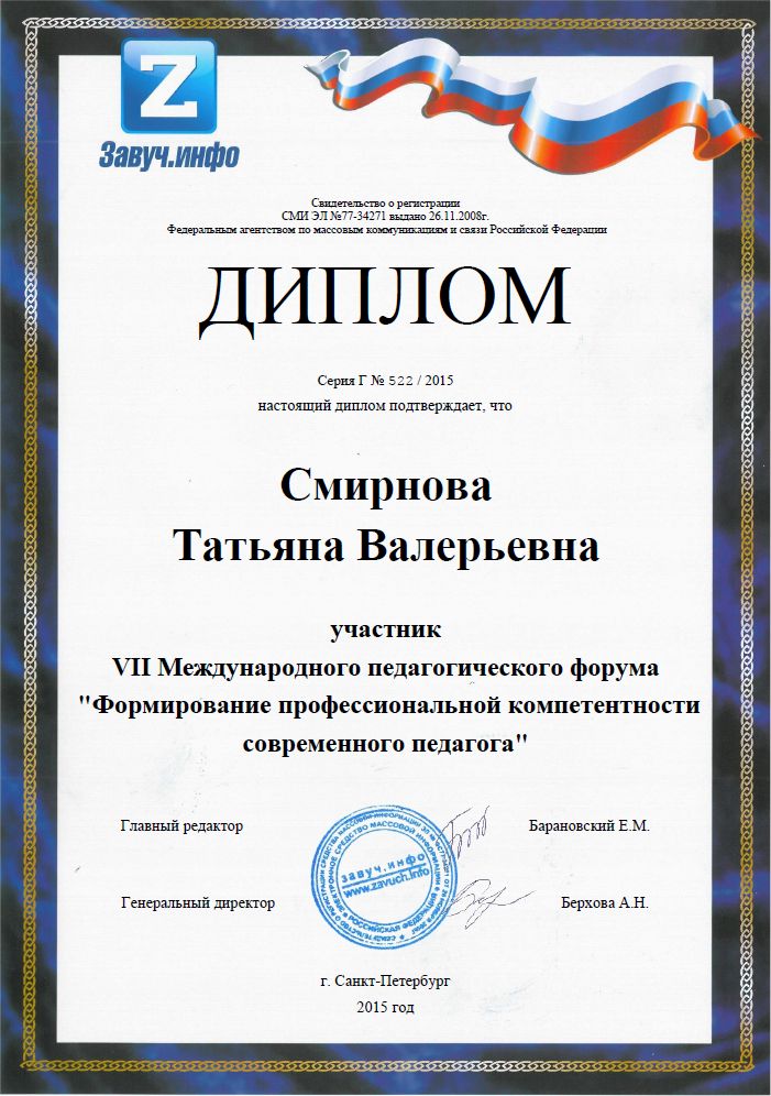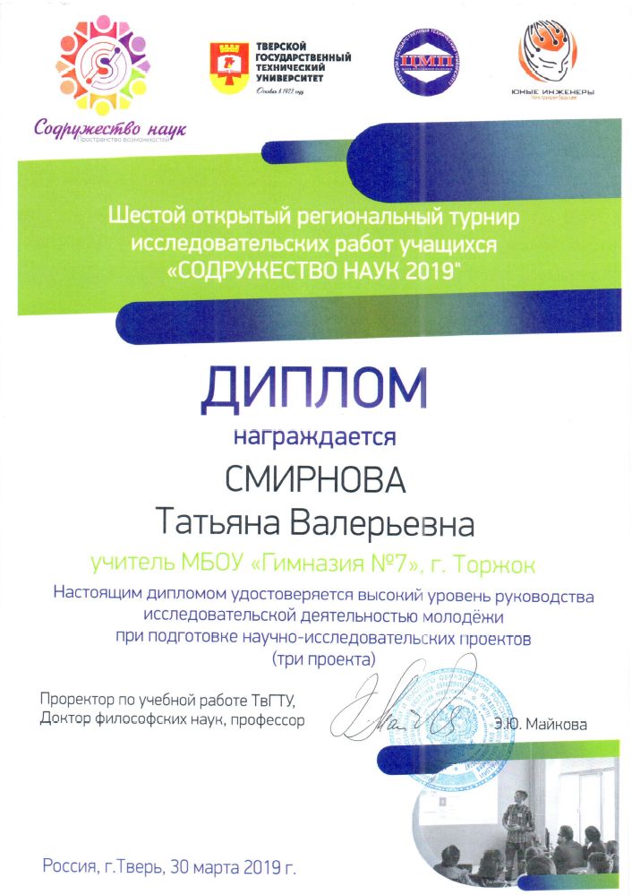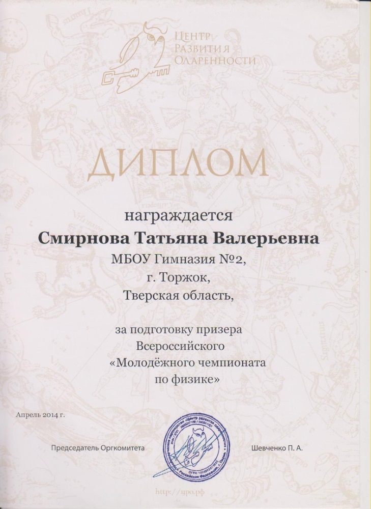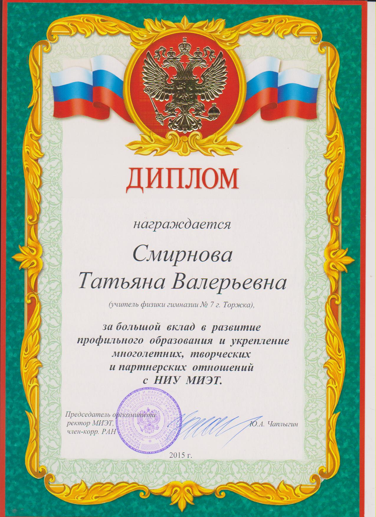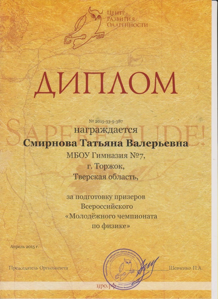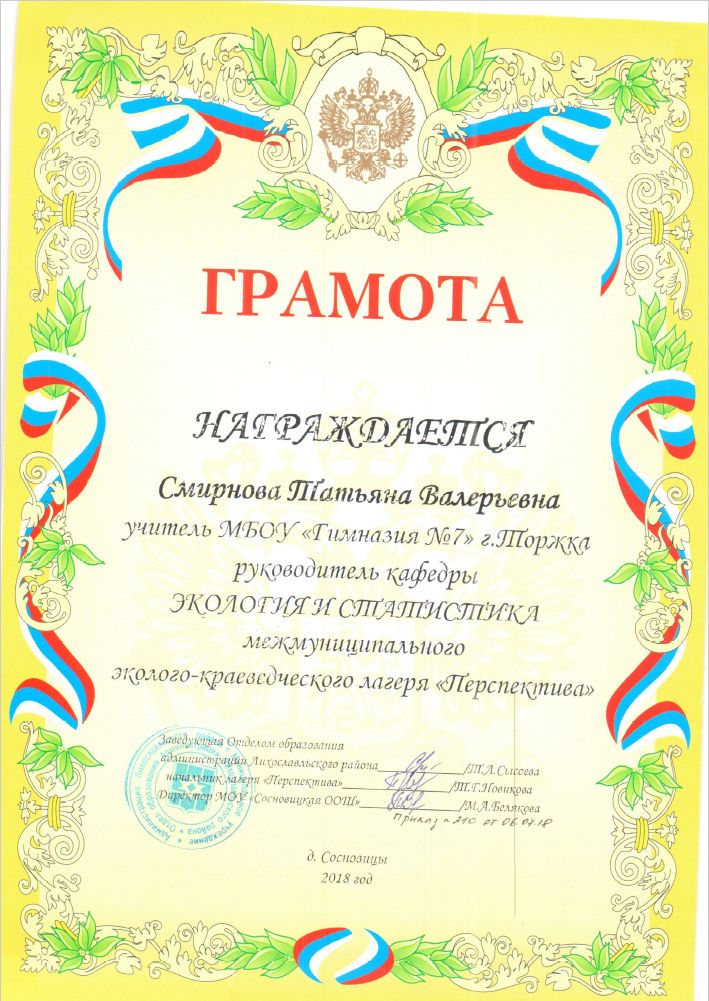 - Почетная грамота Департамента образования Тверской области. Приказ №107–н от 12.05.2011 года