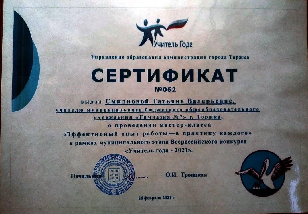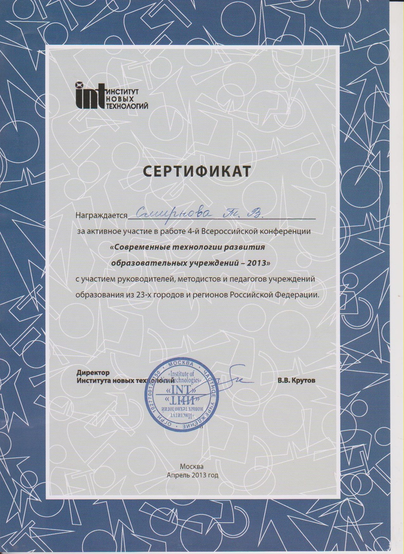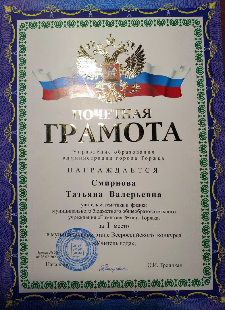 - Грамота Управления образования администрации г. Торжка. Приказ № 418 от 20.12.2006 года.