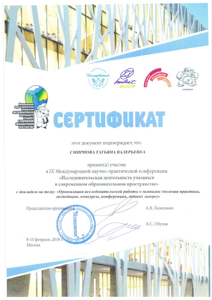 | 2017 | Всероссийский научно-образовательный центр «Современные образовательные технологии» | Формирование проектно-исследовательских компетенций учащихся в соответствии с требованиями ФГОС ООО нового поколения | 72 |