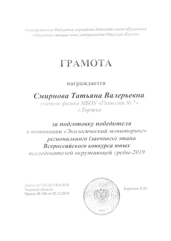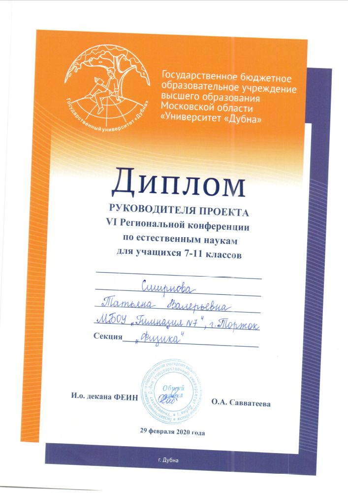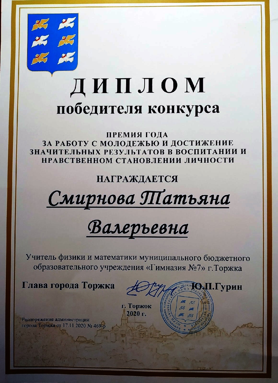 - Диплом победителя конкурса за работу с молодежью и достижение значительных результатов в воспитании и нравственном становлении личности. Распоряжение администрации города Торжка от 17.11.2020 №469-р