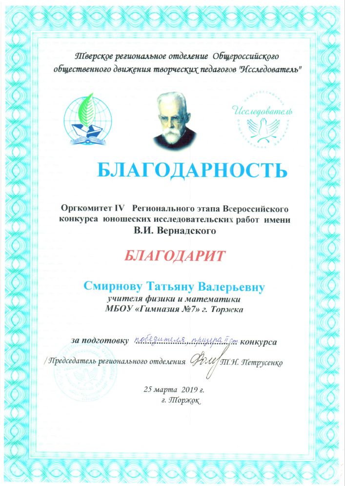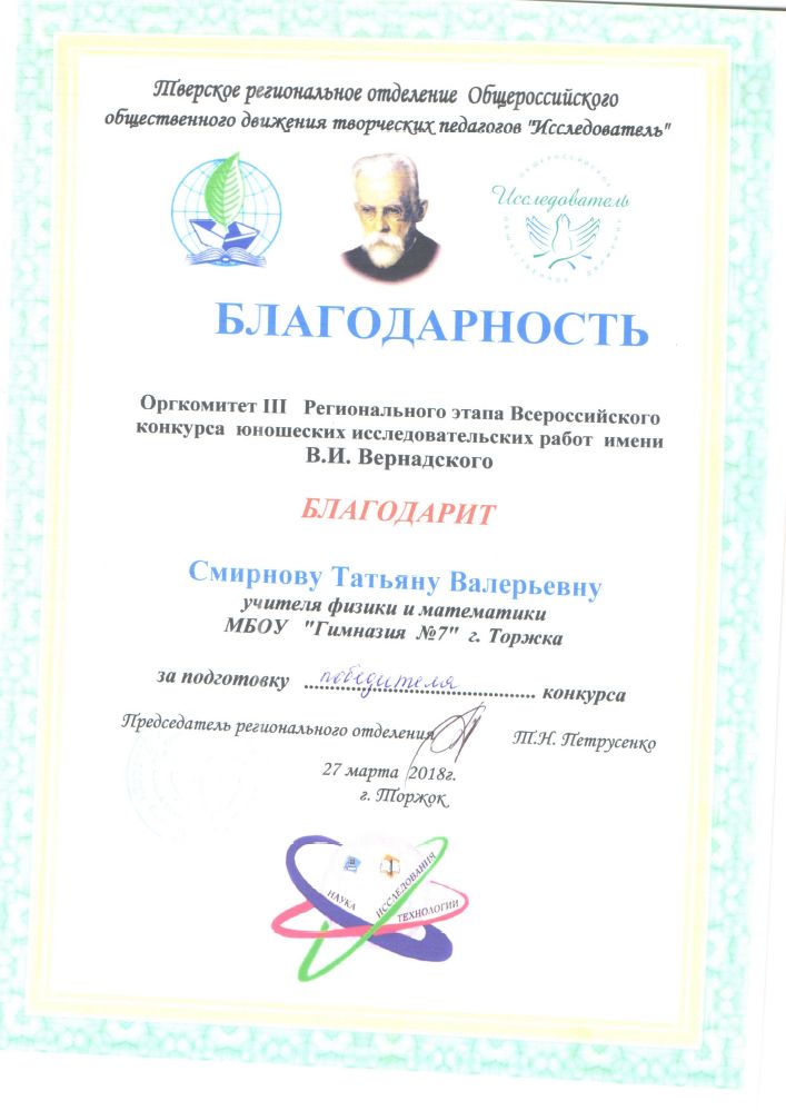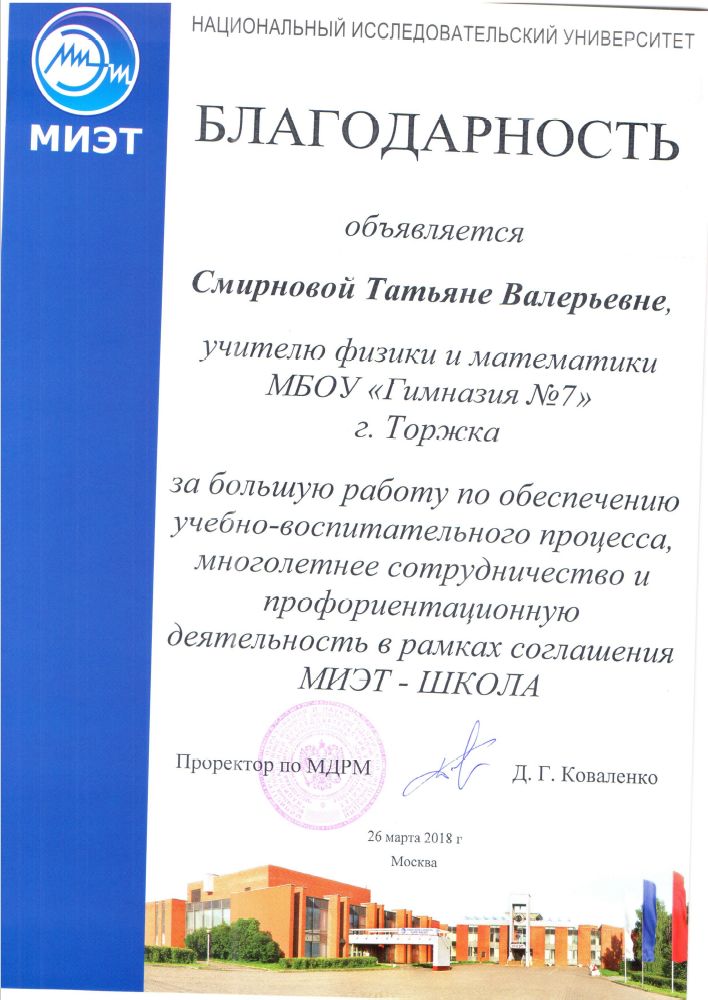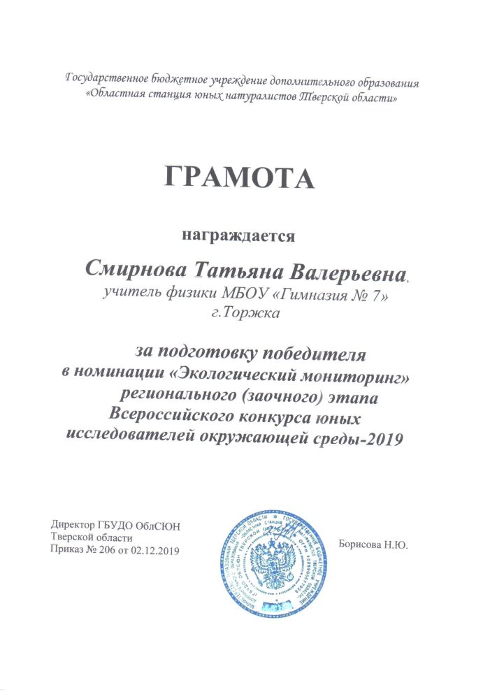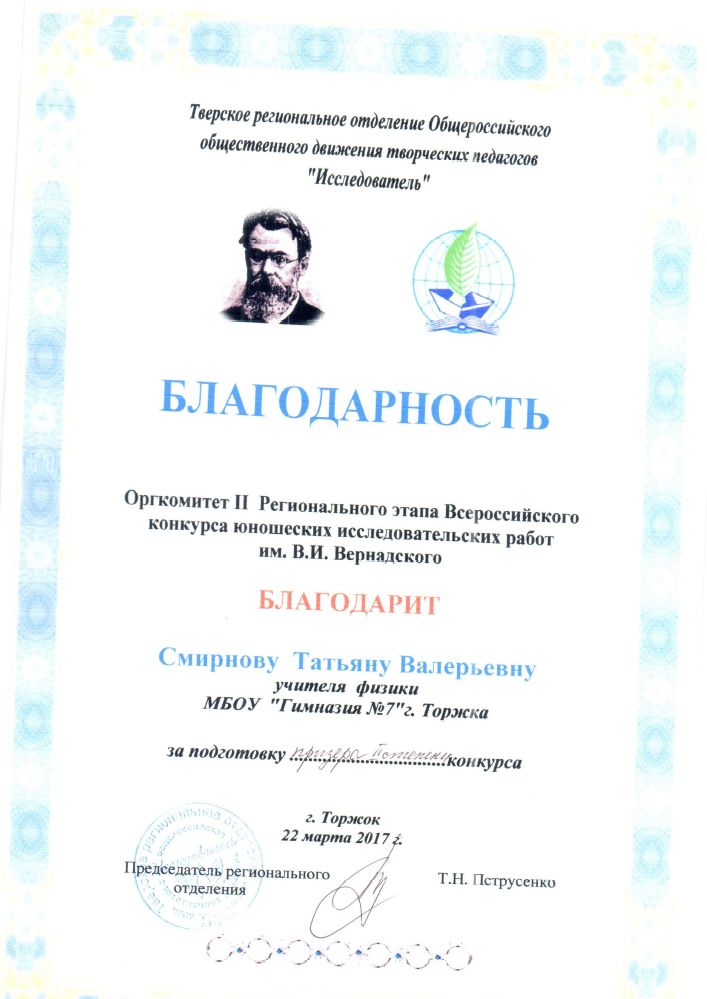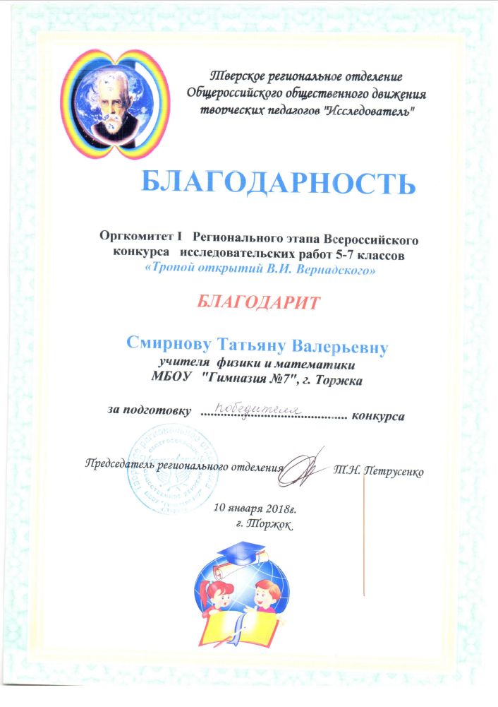 - Благодарственное письмо Управления образования администрации г. Торжка. Приказ № 432 от 24.12.2007 года.